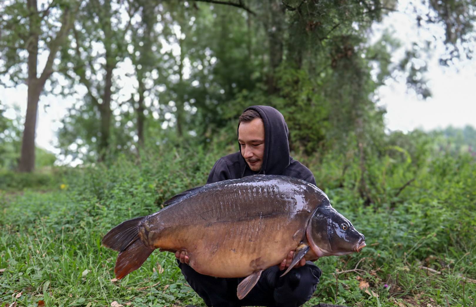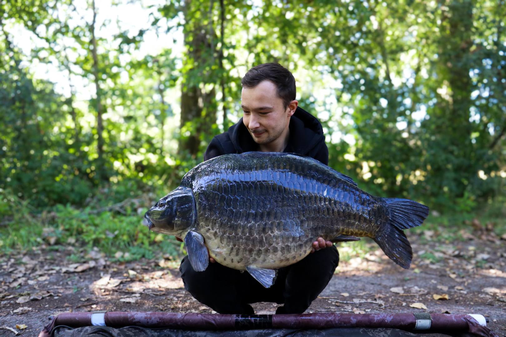 De reis naar een Frans water, zo'n drie uurtjes rijden, begon veelbelovend. Samen met zijn vrouwtje trok Andy eropuit. De sessie startte traag. EΓ©n voorzichtige piep, gevolgd door stilte in het dichte wier. De moed zakte ons even in de schoenen. Maar Andy kennende, gaf niet op! Met de vertrouwde Mighty Squid en Excalibur boilies aan de hair, bleef hij het proberen. Alsof dat nog niet genoeg was werd de rust verstoord door vechtende zwanen die de vislijnen kruisten β een onprettige verrassing langs de waterkant. Toch werd het geduld uiteindelijk beloond.